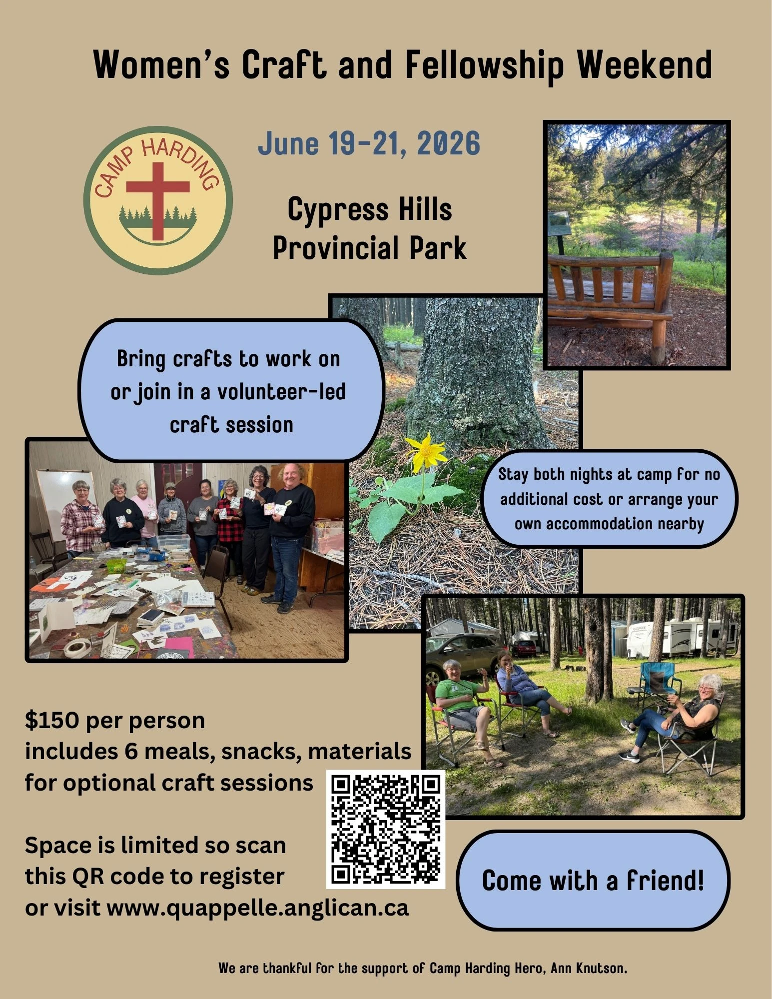 Camp Harding is a beautiful location in Cypress Hills Provincial Park. The camp has four bunk houses, three staff cabins, a washroom and shower facility and a kitchen and dining hall. The camp has running, potable water and electricity. We also have a large fire pit and outdoor chapel. There are lots of walking trails around the camp.
