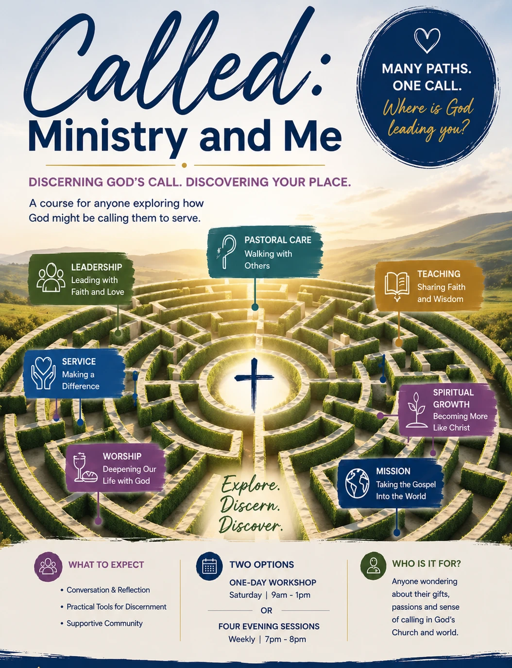 This 4 session course (Zoom), on Thursday evenings, 7-8pm on June 4th, 11th, 18th, and 25th explores one’s sense of calling/vocation and the process of discernment.