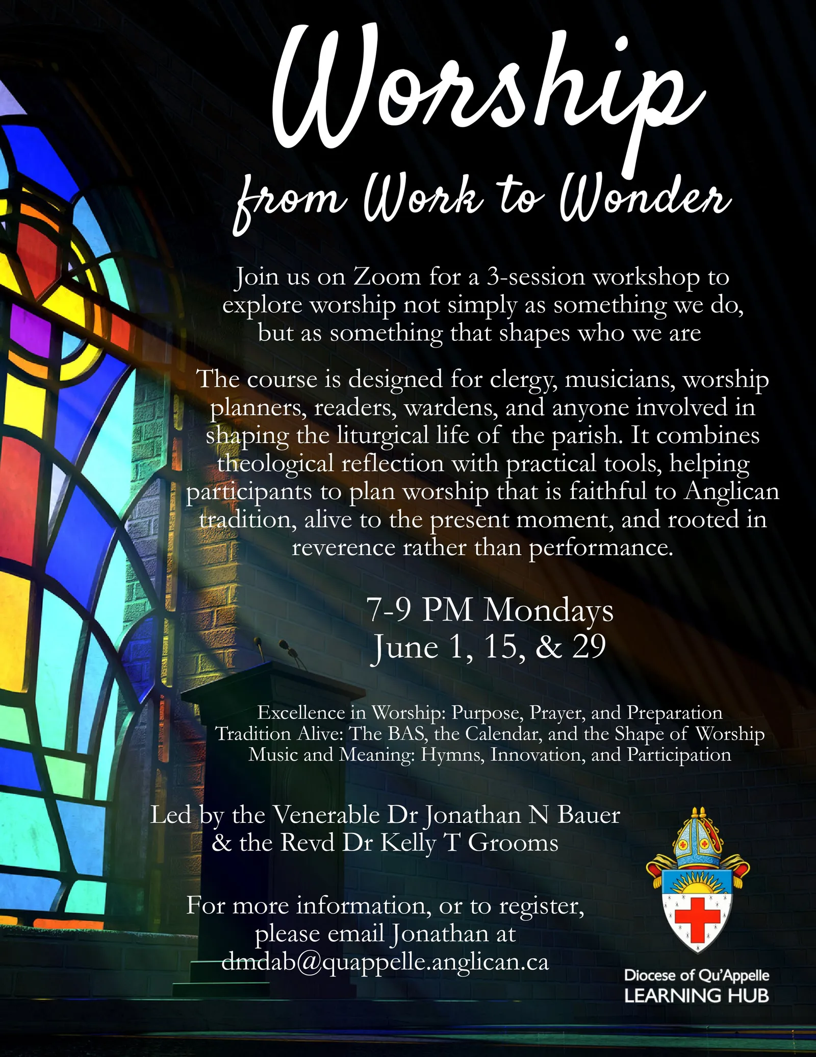This three session course (Zoom), on Monday evenings, 7-9pm on June 1st, 15th, and 29th explores worship planning, resources, and the importance of delivering excellence in worship ... and reflecting on what 'excellence' might look and feel like.