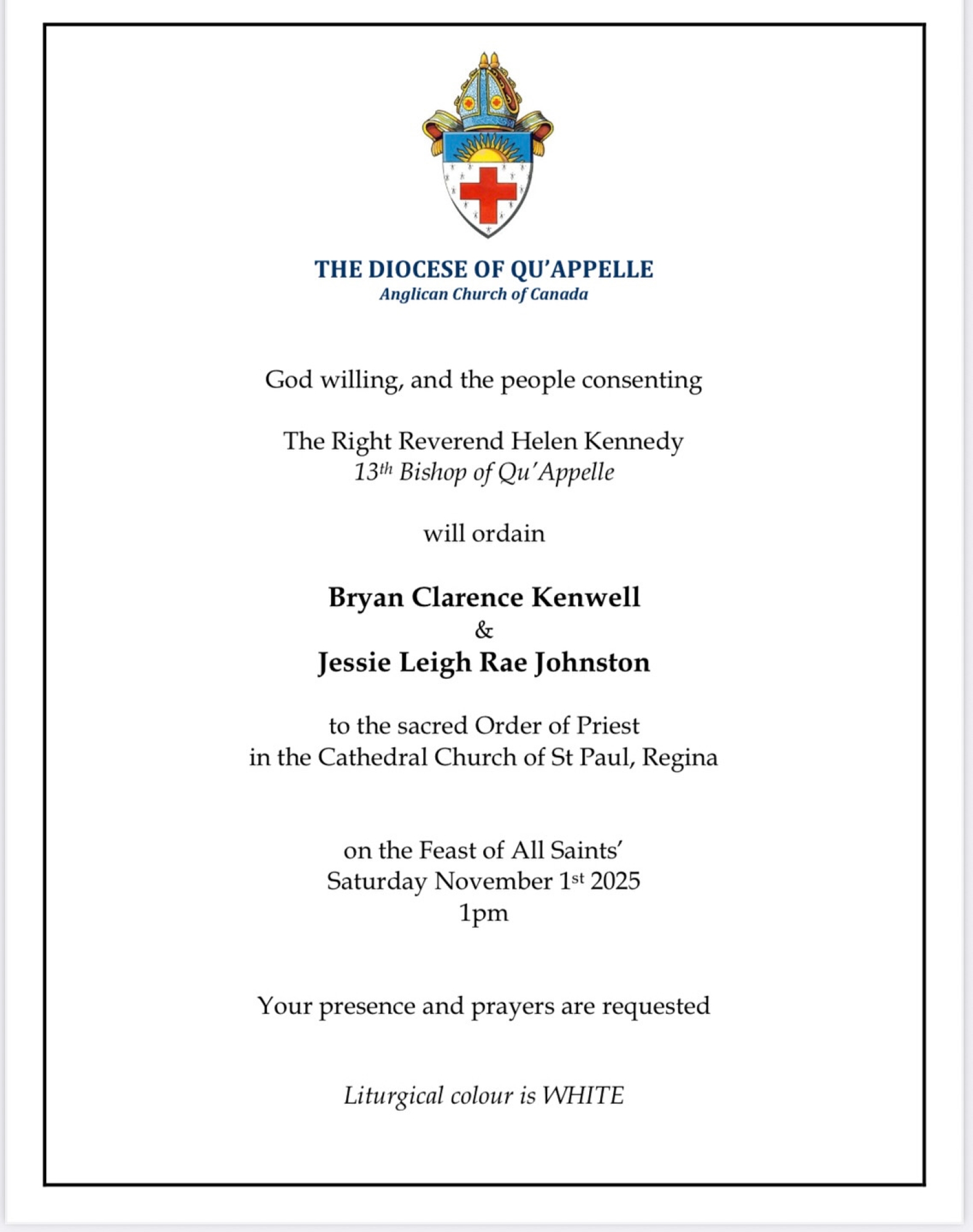 October 10, 2025 | Synod Office Powered by Sign in / Register Our Diocese Diocesan LeadershipChurches & ClergySt. Paul's CathedralLand acknowledgementAbout the DioceseHistory of Qu'AppelleQu'Appelle House Care Home News NewsEventsJob PostingsTell us a Story Ministries Refugee SponsorshipIndigenous MinistryCamp HardingCompanion DiocesesEcumenicalDiocesan Prayer Shawl MinistryHospital ChaplaincyAnglican Church Women Qu'Appelle School AboutUpcoming CoursesLicentiate in TheologyCourse Offerings Resources Stewardship Works!FinanceDiocesan Prayer DiarySafe ChurchDiocesan Canons and RegulationsSaskatchewan AnglicanDiocesan ArchivesNational Church links and resourcesAnglican Foundation of Canada DonateContact